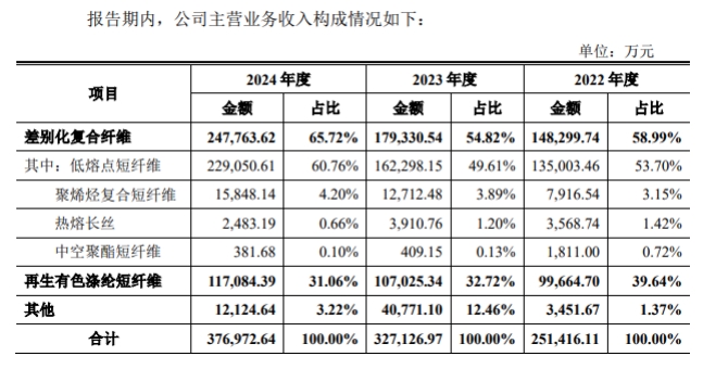招股書顯示,差別化復合纖維是公司最主要的收入來源,該類產品2024年貢獻了65.72%的營業收入,顯示出其在高端市場中的強大競爭力。公司還計劃通過擴大聚烯烴復合短纖維、高彈力復合滌綸短纖維等差別化新產品的生產規模,以滿足市場對高端、環保、功能性產品的需求,為公司提供新的增長點。