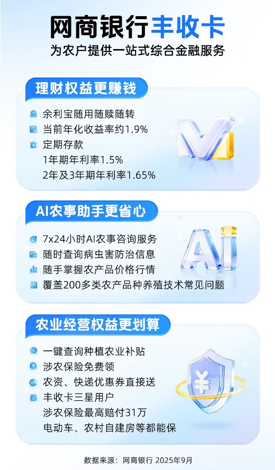 合作內(nèi)容主要包括兩方面:一是雙方將通過政策引導(dǎo)、資源協(xié)調(diào)等方式,優(yōu)先在山東特色產(chǎn)業(yè)主產(chǎn)區(qū)推廣豐收卡,方便農(nóng)戶掃碼開通和使用;二是依托網(wǎng)商銀行的大數(shù)據(jù)風(fēng)控能力,為山東省內(nèi)種養(yǎng)大戶、農(nóng)業(yè)企業(yè)、鄉(xiāng)村帶頭人、新型職業(yè)農(nóng)民等群體提供更靈活的信貸服務(wù)。 記者獲悉,豐收卡整合了存款、理財(cái)、信貸、AI農(nóng)事助手以及多項(xiàng)免費(fèi)助農(nóng)權(quán)益,全面滿足農(nóng)戶多樣化生產(chǎn)經(jīng)營需求。“AI農(nóng)事助手”相當(dāng)于一位24小時(shí)在線的“農(nóng)技專家”,并接入1000名專家在線支持,可實(shí)時(shí)解答200多種種植作物、家禽家畜的種養(yǎng)問題,還可提供災(zāi)害預(yù)警、天氣提醒和農(nóng)產(chǎn)品價(jià)格查詢等功能,幫助農(nóng)戶告別“憑經(jīng)驗(yàn)種地、靠天吃飯”的傳統(tǒng)模式。 招遠(yuǎn)葡萄種植戶劉旭峰說:“以前擔(dān)心天氣病害、價(jià)格波動(dòng),現(xiàn)在擁有了豐收卡,手機(jī)一點(diǎn)就有辦法,種地越來越有信心! 在資金管理方面,為響應(yīng)國家提升農(nóng)民財(cái)產(chǎn)性收入的號(hào)召,豐收卡推出了定期存款、靈活理財(cái)?shù)榷喾N產(chǎn)品,更好匹配農(nóng)業(yè)生產(chǎn)周期和資金使用節(jié)奏,切實(shí)緩解農(nóng)戶“理財(cái)難、管錢難”的問題。此外,網(wǎng)商銀行還將與山東省農(nóng)業(yè)農(nóng)村廳在設(shè)施農(nóng)業(yè)、海洋漁業(yè)等領(lǐng)域深化產(chǎn)業(yè)金融合作,為各地搭建授信模型,進(jìn)一步擴(kuò)大普惠金融服務(wù)的覆蓋范圍。